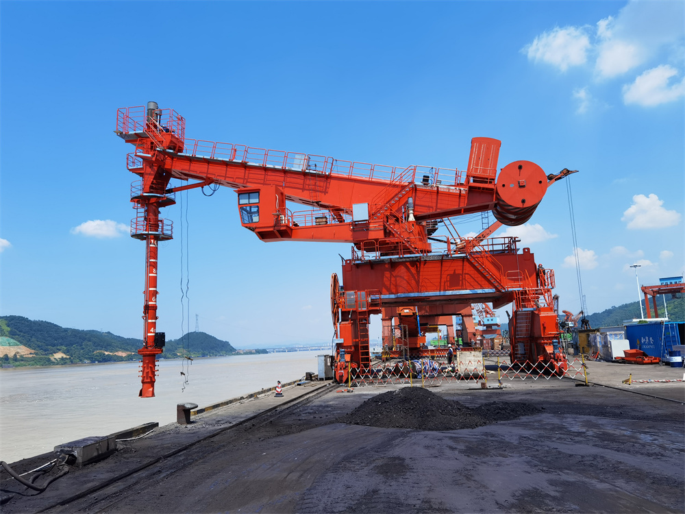 螺旋式卸船机属于连续卸船机,由以下部分所组成:沿顺岸轨道移动的门架及行走小车;支承在门架上并绕中心旋转的平台;由变幅油缸驱动可上下俯仰的水平伸臂及固定其上的水平螺旋输送机;由摆动油缸驱动可绕水平伸臂端部前后摆动的竖直臂及固接其上的垂直螺旋输送机;安装在垂直螺旋下端的松料螺旋及取料装置;位于门架上旋转塔架下方的水平螺旋输送机;码头后方带式输送机等。